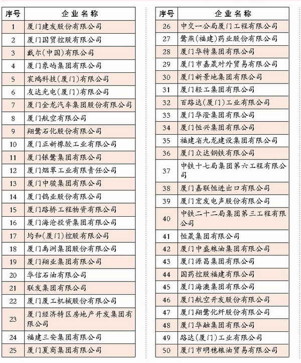 2014廈門企業(yè)100強榜單